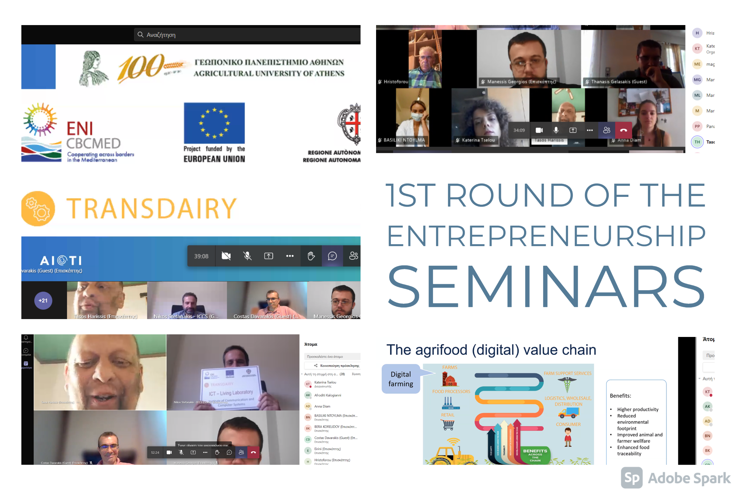 Ολοκληρώθηκε με επιτυχία ο 1ος κύκλος σεμιναρίων επιχειρηματικότητας του έργου TRANSDAIRY του προγράμματος ΕΝΙ CBC MED. Τα σεμινάρια πραγματοποιήθηκαν διαδικτυακά (λόγω COVID-19) στις 27-30 Ιουλίου 2021 και συνδιοργανώθηκαν από τους δύο Ελληνικούς φορείς του έργου (Ερευνητικό Πανεπιστημιακό Ινστιτούτο Συστημάτων Επικοινωνιών & Υπολογιστών – ΕΠΙΣΕΥ, Γεωπονικό Πανεπιστήμιο Αθηνών – ΓΑΠ) και τα Living Labs.